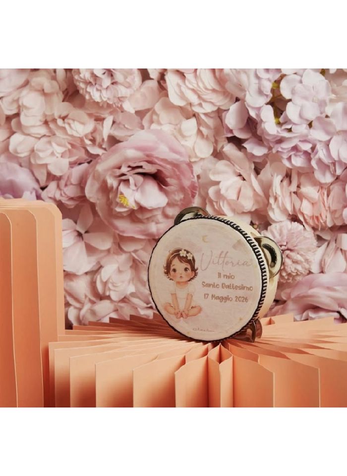 Tamburello in legno con decorazione battesimo femmina