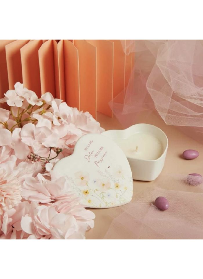 Scatola in ceramica a forma di cuore con decoro floreale rosa con candela