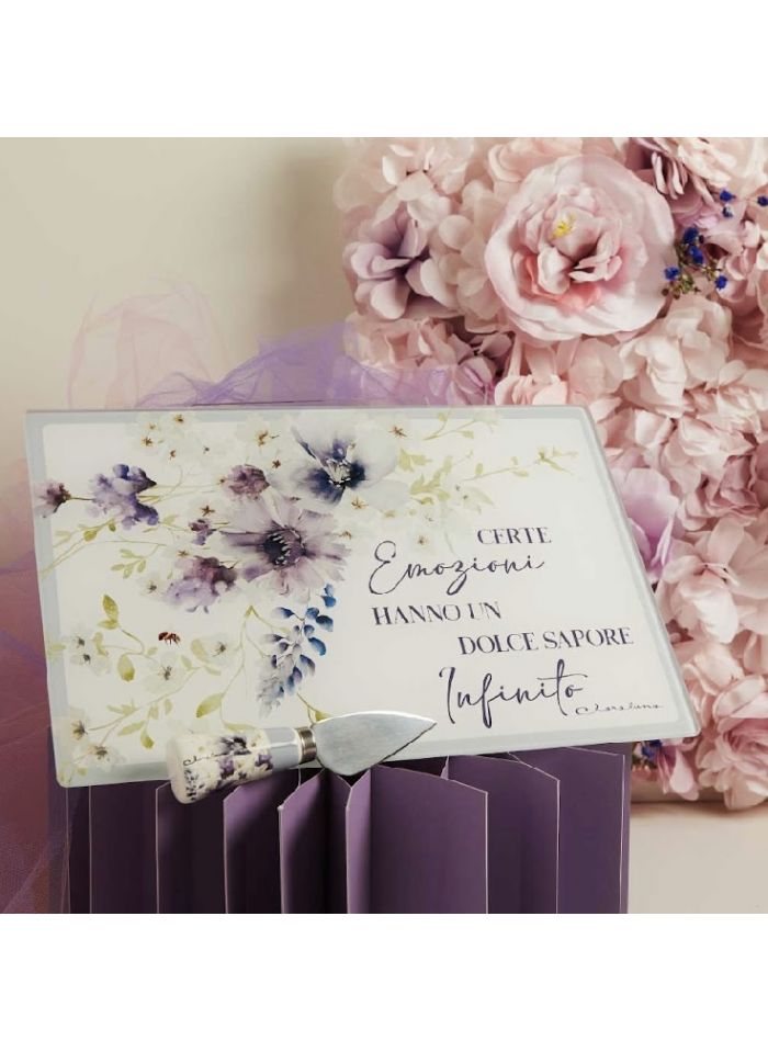 Tagliere in vetro con coltellino con decoro floreale lilla