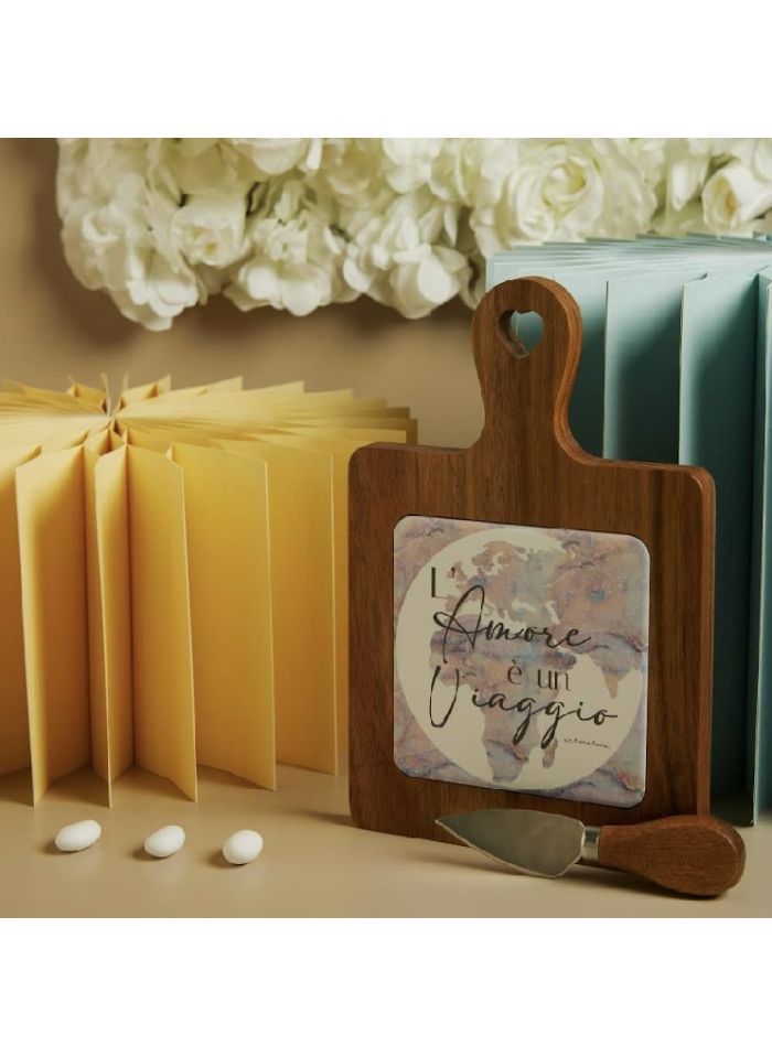 Tagliere acacia con decorazione mondo con coltellino