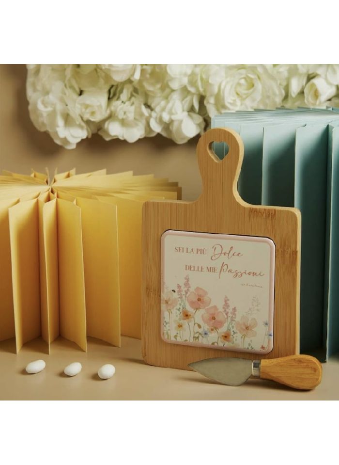 Tagliere acacia con decorazione floreale rosa con coltellino