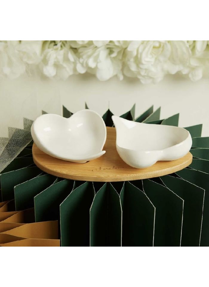 Vassoio in bamboo con due ciotole in ceramica a forma di cuore