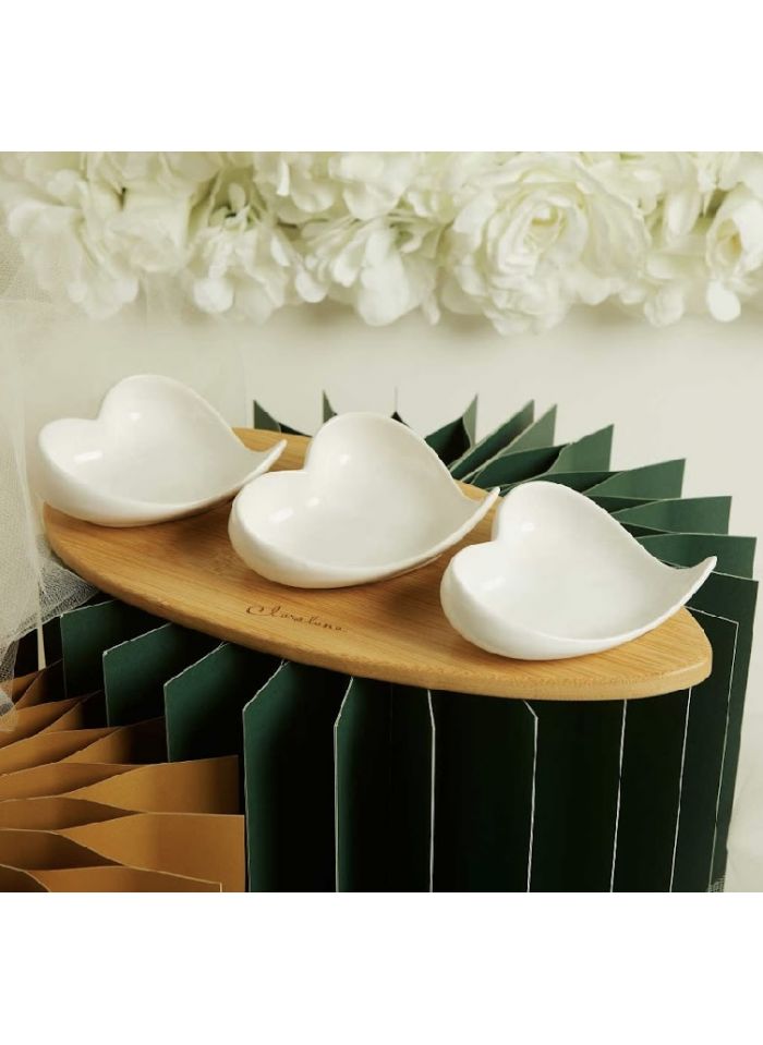 Vassoio in bamboo con tre ciotole in ceramica a forma di cuore