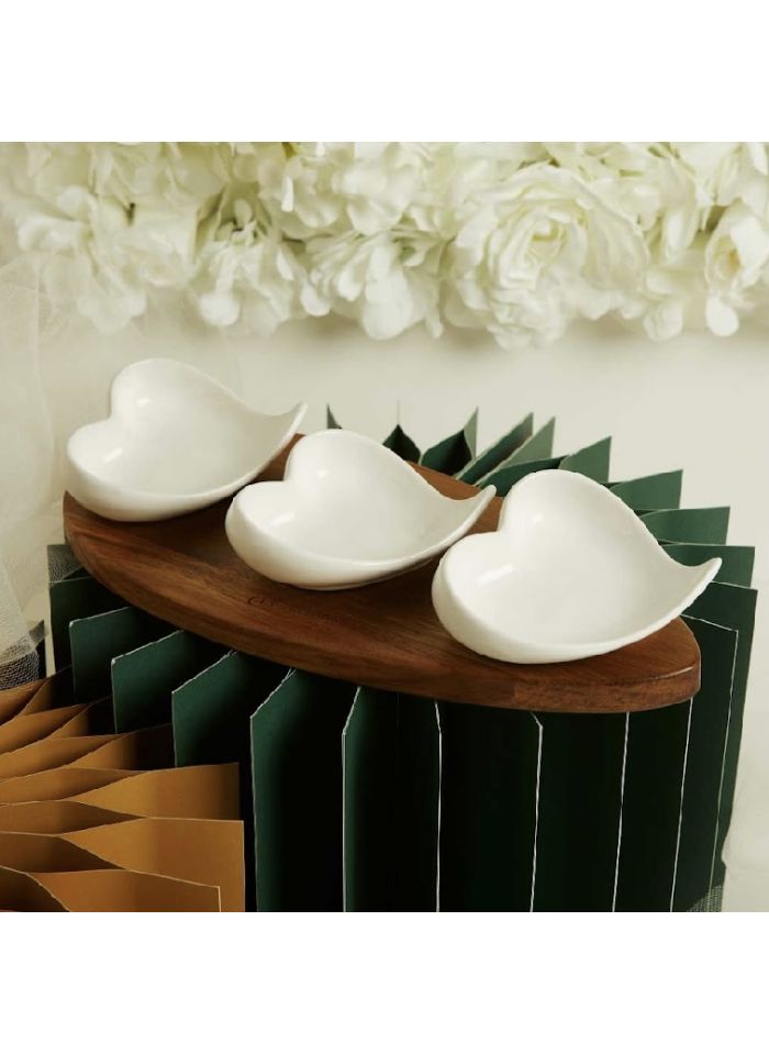 Vassoio in acacia con tre ciotole in ceramica a forma di cuore