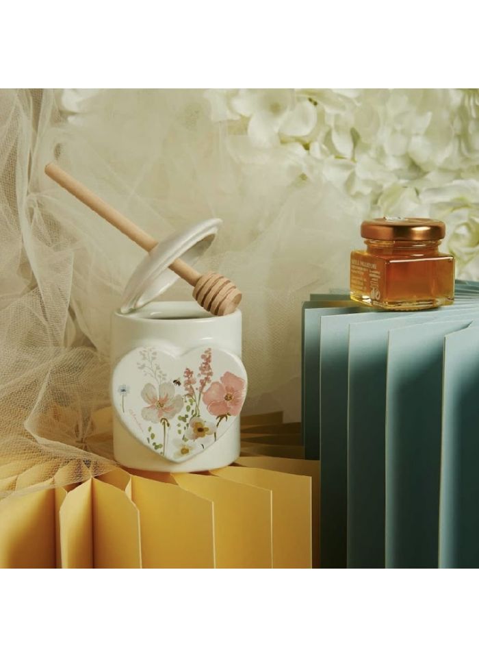 Porta miele bianco con spargimiele e decoro floreale rosa con vasetto di miele