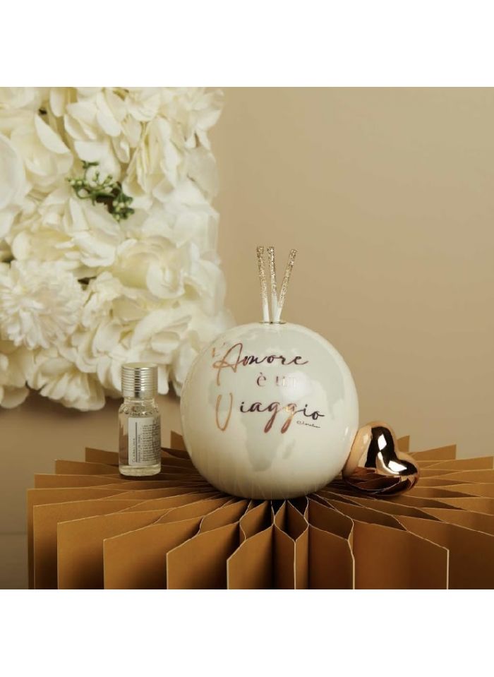 Diffusore globo grande con cuoricino oro rosa, completo di kit bacchette e profumino