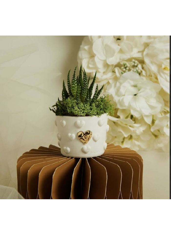 Vasetto in gesso cuoricini con applicazione in oro con piantina e muschio