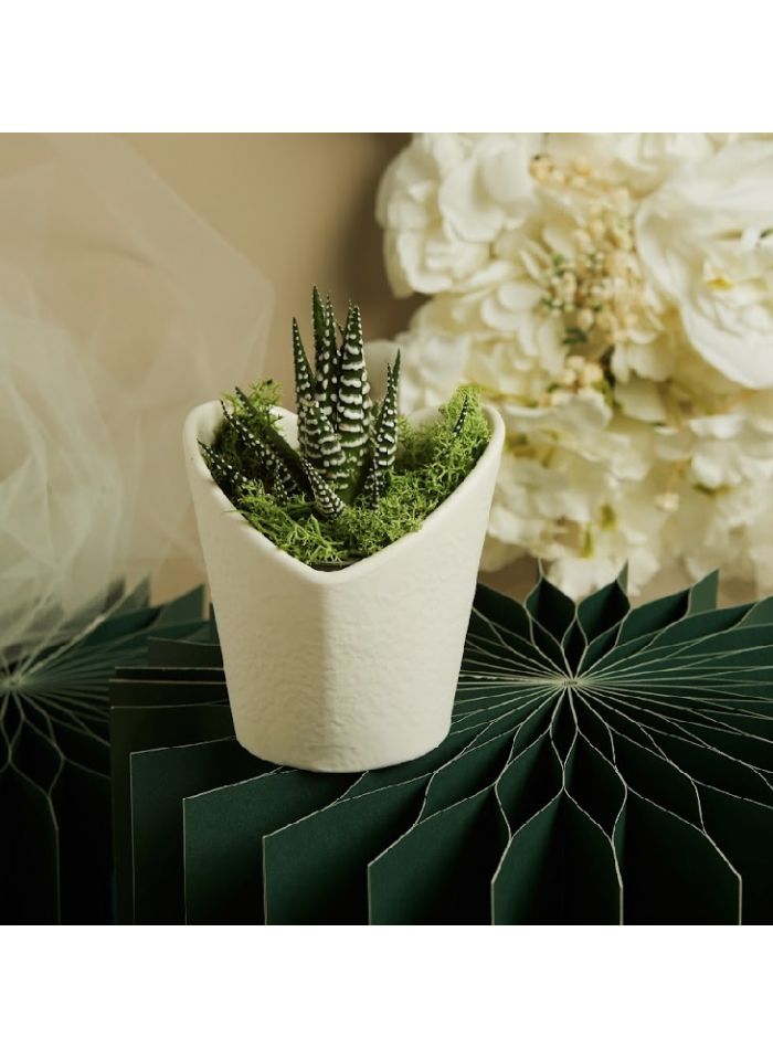Vasetto in ceramica bianca grande cuore con piantina e muschio
