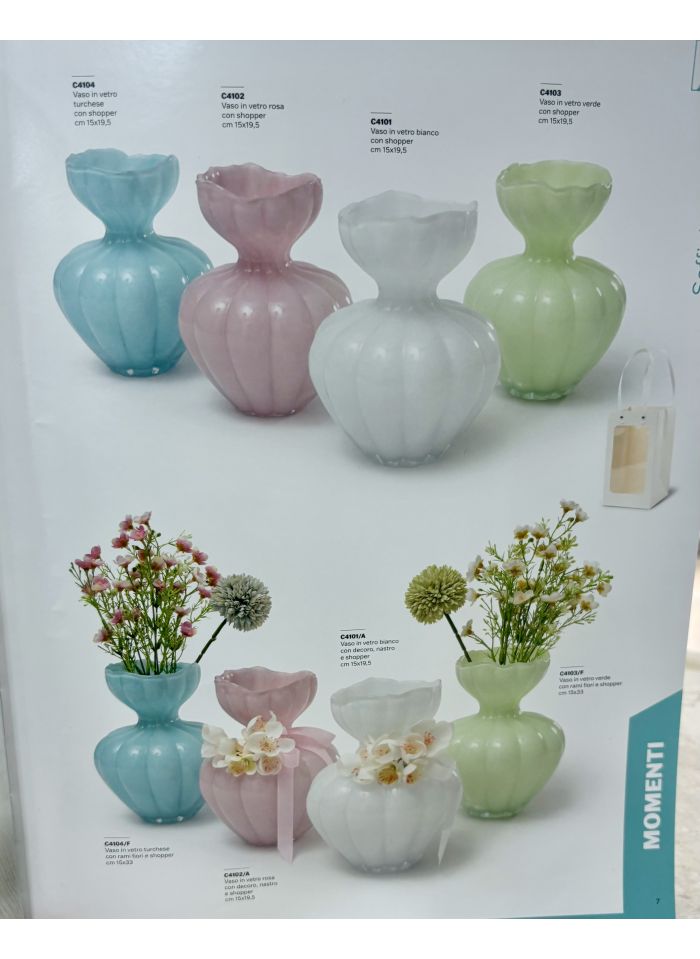 Vaso in vetro rosa con nastro e decoro con shopper (c4102A)