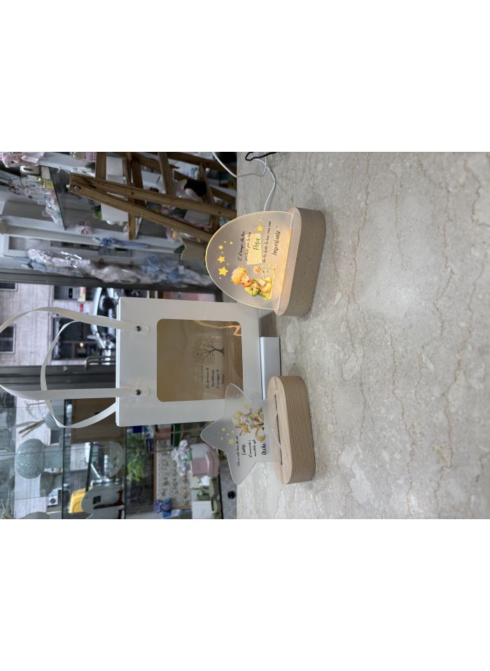 Lampada led con plexy casetta con albero della vita colorato, con base in legno con shopper